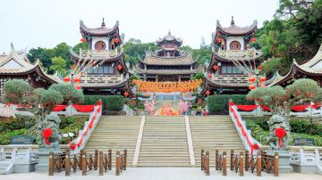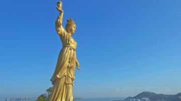誉为“海上布达拉宫”里面分别有很多小庙 由金木水火土五元素打造的金尊妈祖 红木妈祖 chē qú妈祖 翡翠妈祖、泥塑妈祖