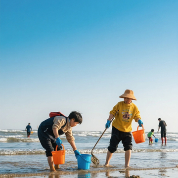 抵达海岸滩涂渔场,步行5分钟至海边,在海边资深渔民带领下到滩涂渔场体验赶海乐趣。卷起裤子、带着特制的工具,到浅海滩涂捕捉鱼虾、挖蛤蜊、捡贝壳,享受大海的馈赠~。潮水退去,打桩扎网,渔民幸事,各种海鱼海蟹犹如探囊取物,退潮后收获丰收海产体验渔民的生活。