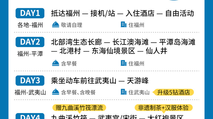 福州+平潭+武夷山+泉州6日5晚跟团游·【山海奇遇·闽韵悠游】升级1晚5钻花园酒店〖平潭海岛游+九曲溪竹筏漂流+蟳埔簪花体验〗从蔚蓝海岸到水墨丹青:平潭岛·猴研岛奇遇·武夷山水诗行·泉州古厝时光开元寺·泉州西街·平潭岛·仙人井·武夷山·南少林寺·泉州古城